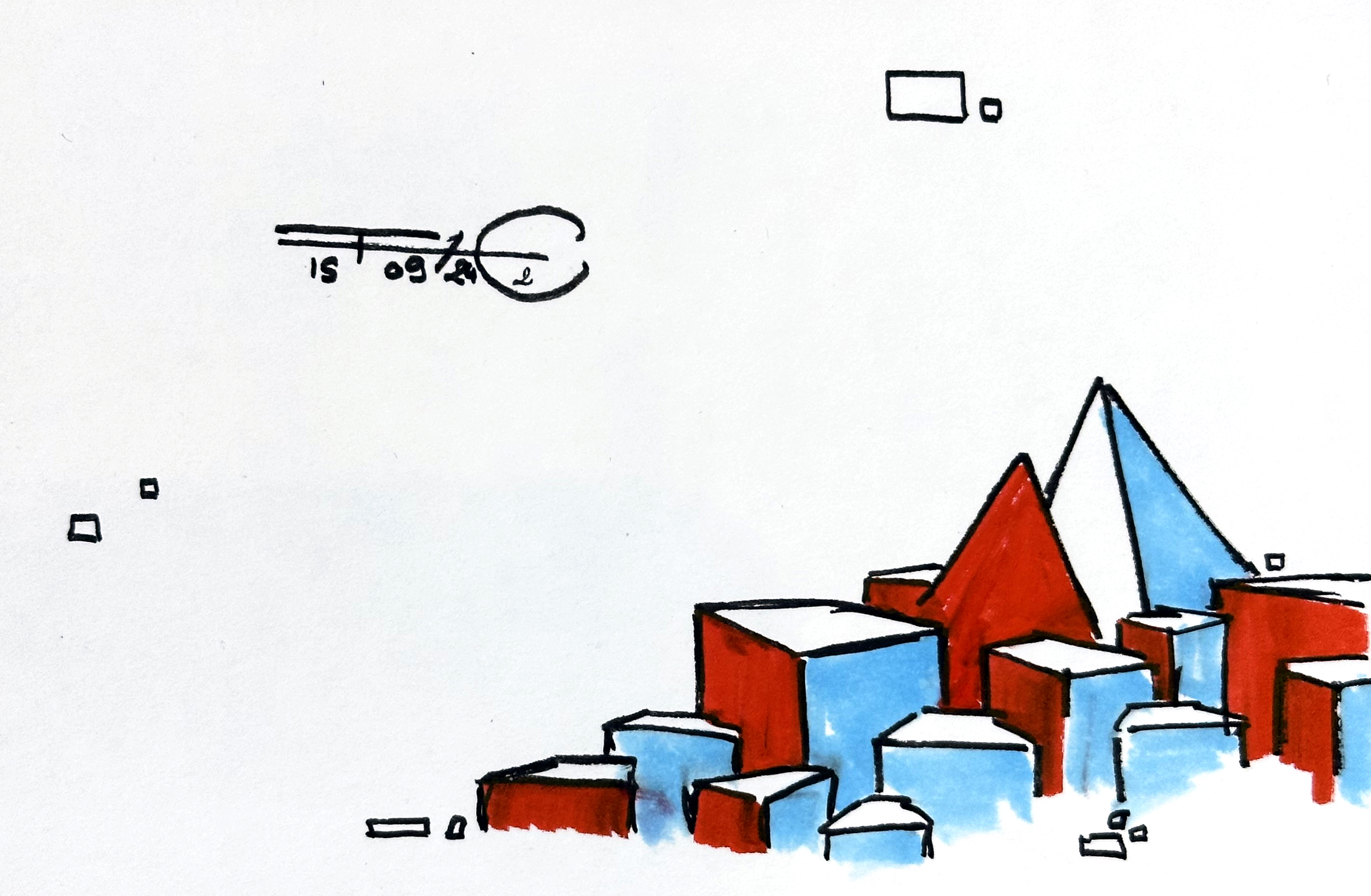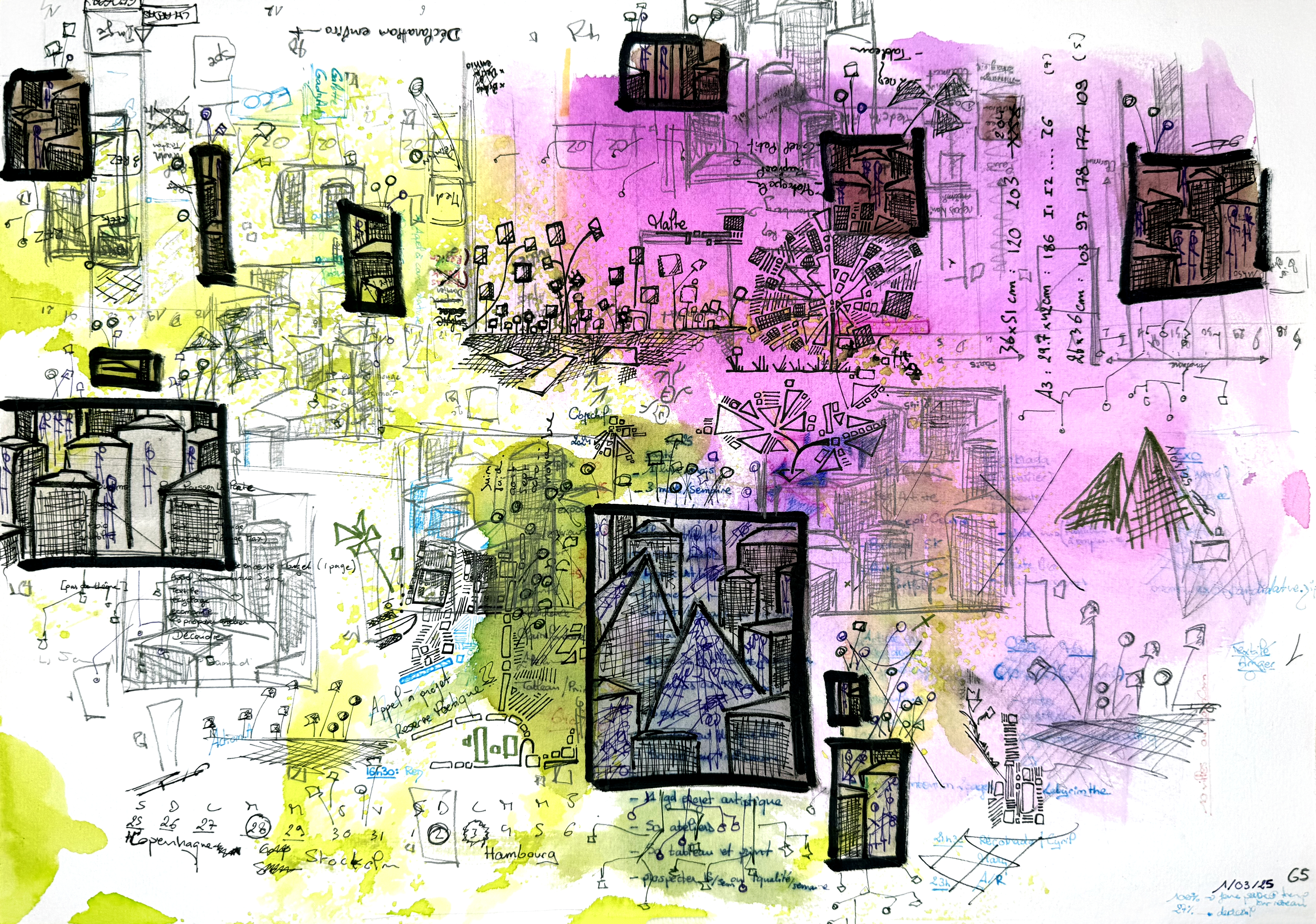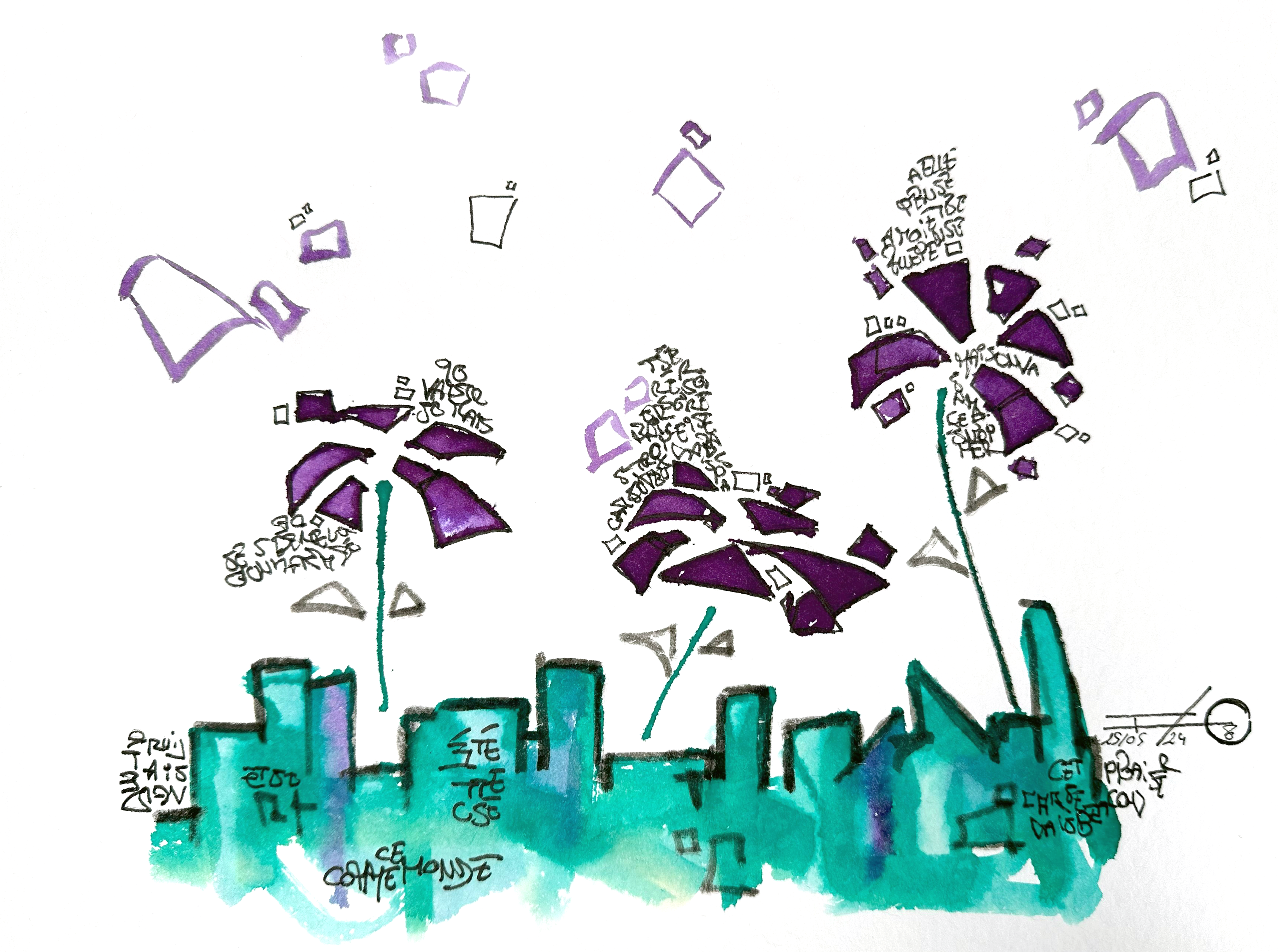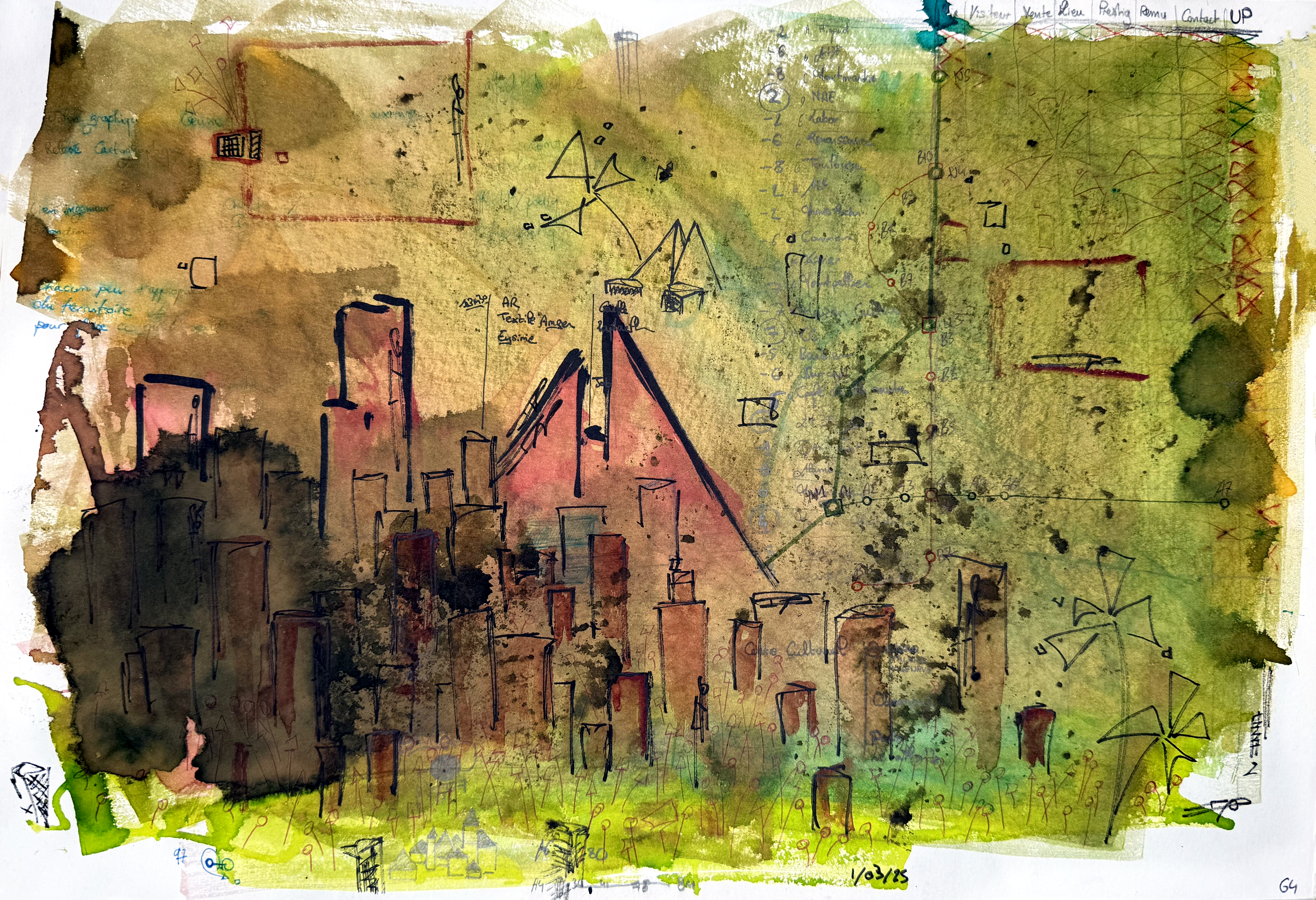 Une série de 220 encres sur papier aux formats variés qui explore des mondes imaginaires géométriques et poétiques. Un questionnement sur notre société, notre manière d’habiter le monde, la construction de nos cités autour des règles géométriques. Il s’agit généralement de villes, ou éléments architecturaux fantasmés. Des formes, des mots, des chiffres viennent se mélanger sur le papier. C’est de la poésie. Chaque mot, chaque forme, chaque chiffre, chaque coup de pinceau suit une musique, une partition.