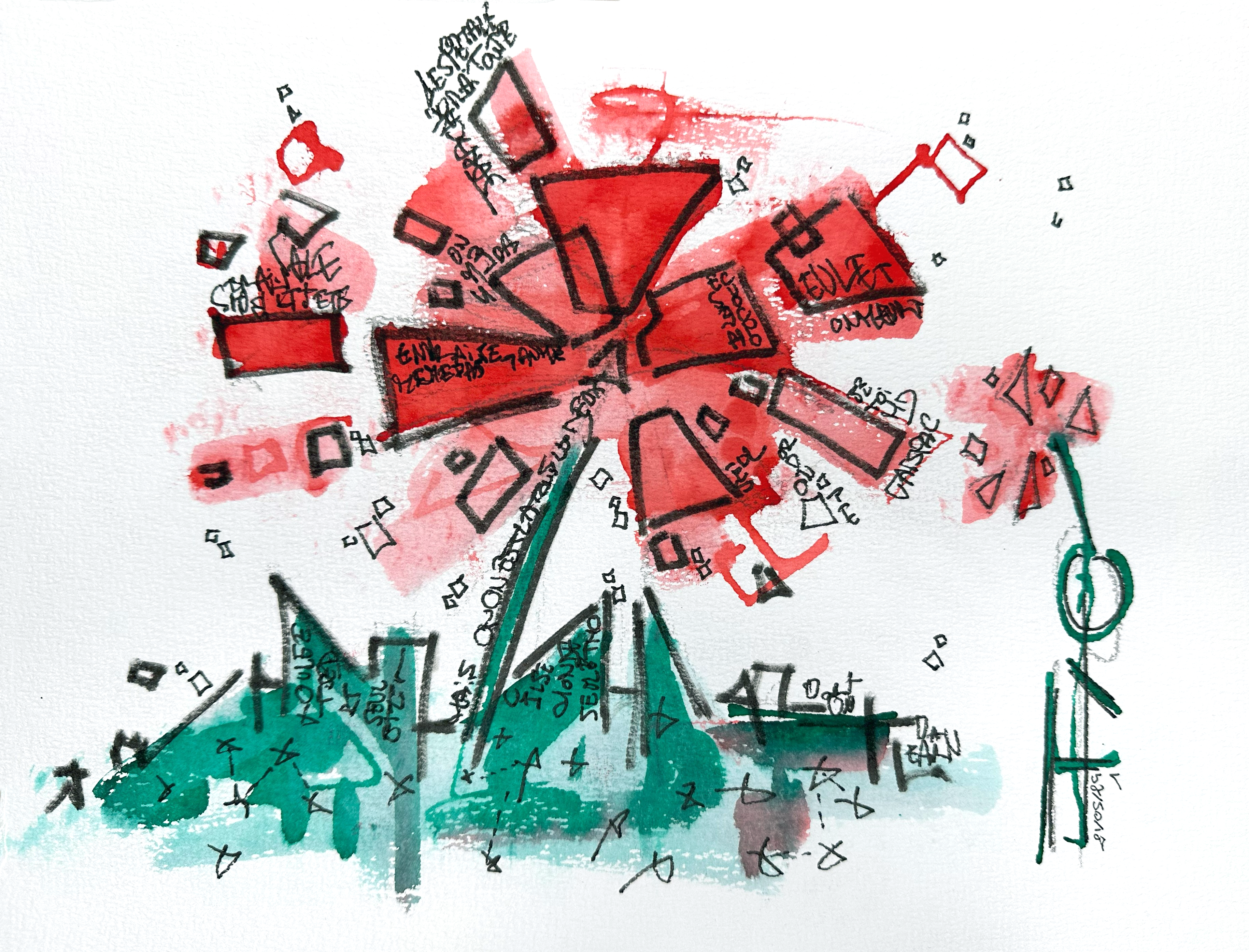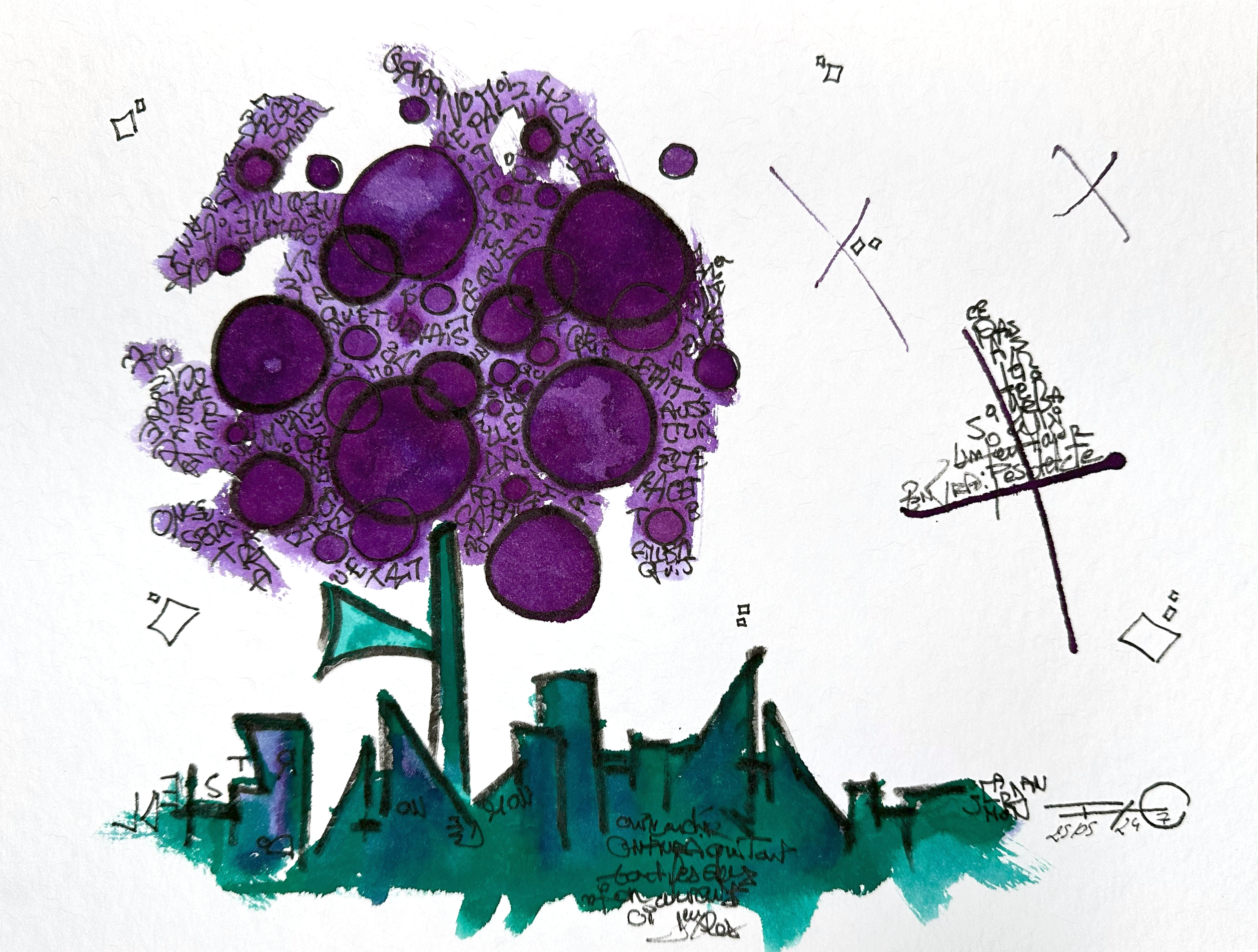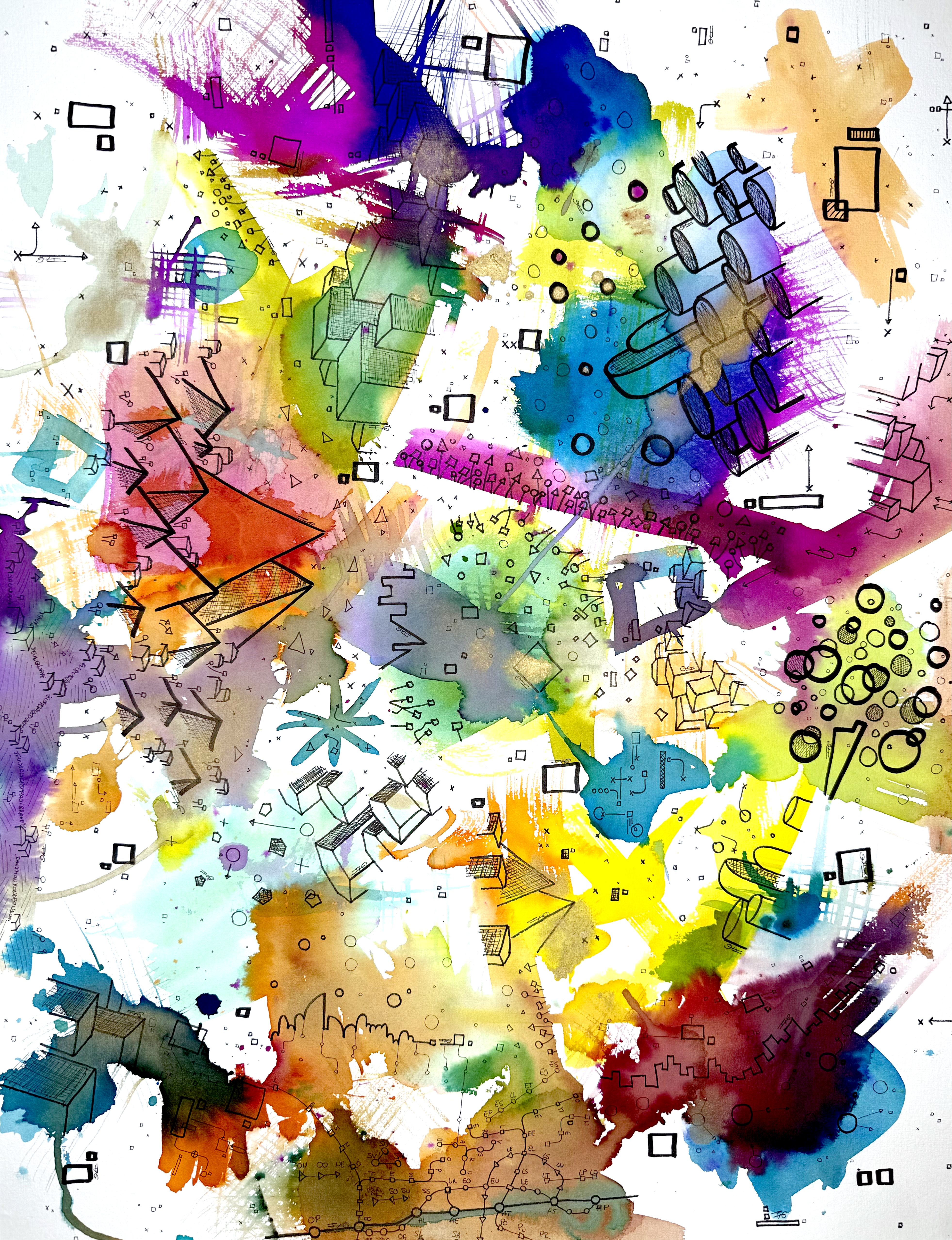 Une série de 220 encres sur papier aux formats variés qui explore des mondes imaginaires géométriques et poétiques. Un questionnement sur notre société, notre manière d’habiter le monde, la construction de nos cités autour des règles géométriques. Il s’agit généralement de villes, ou éléments architecturaux fantasmés. Des formes, des mots, des chiffres viennent se mélanger sur le papier. C’est de la poésie. Chaque mot, chaque forme, chaque chiffre, chaque coup de pinceau suit une musique, une partition.