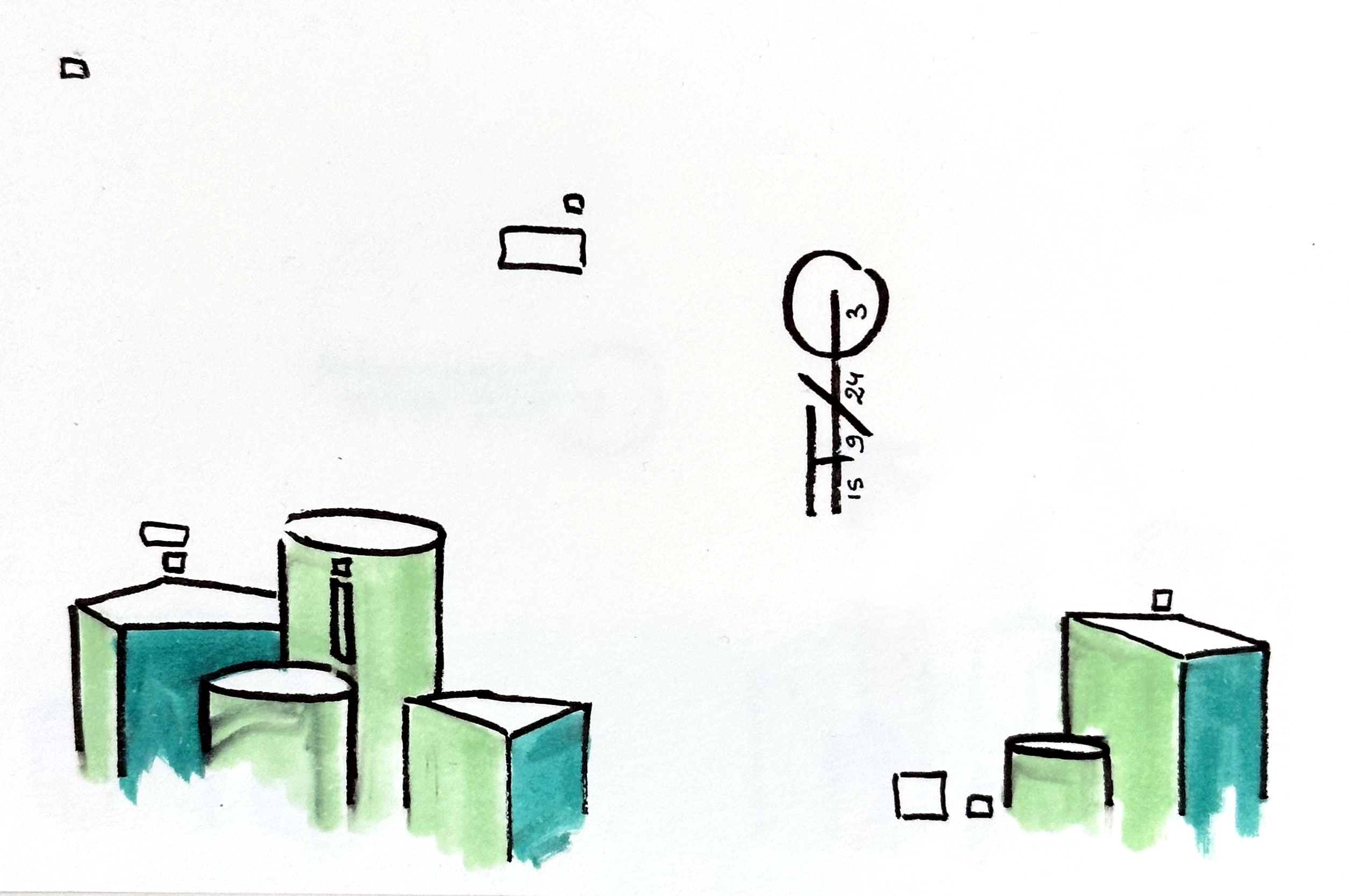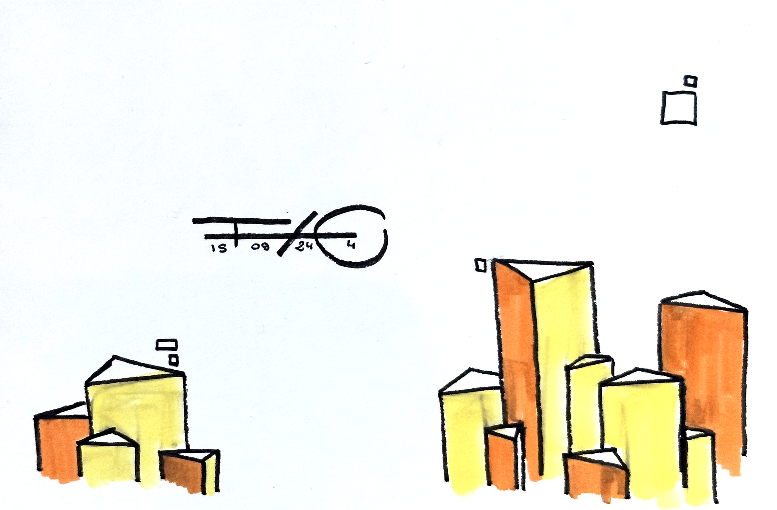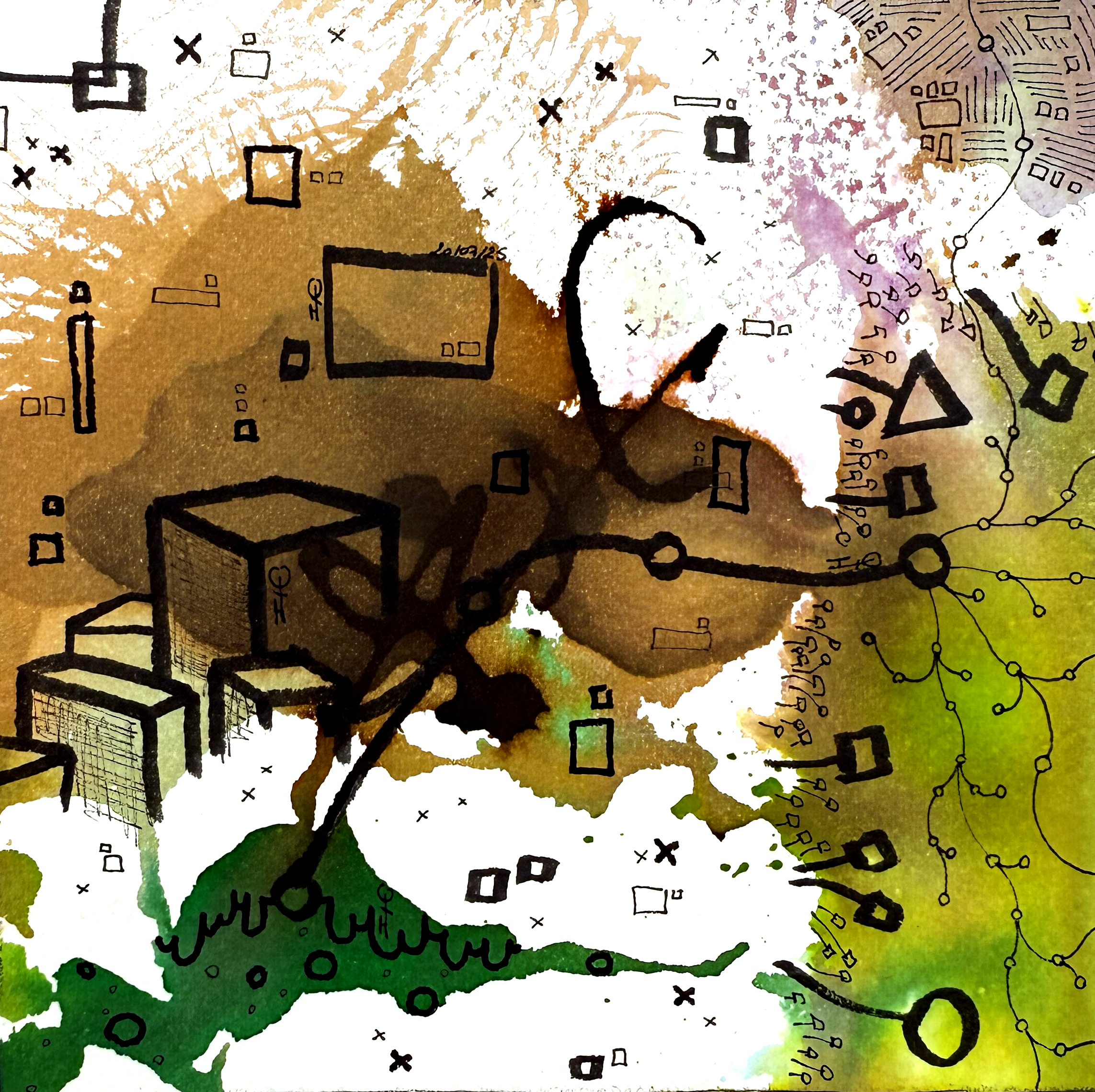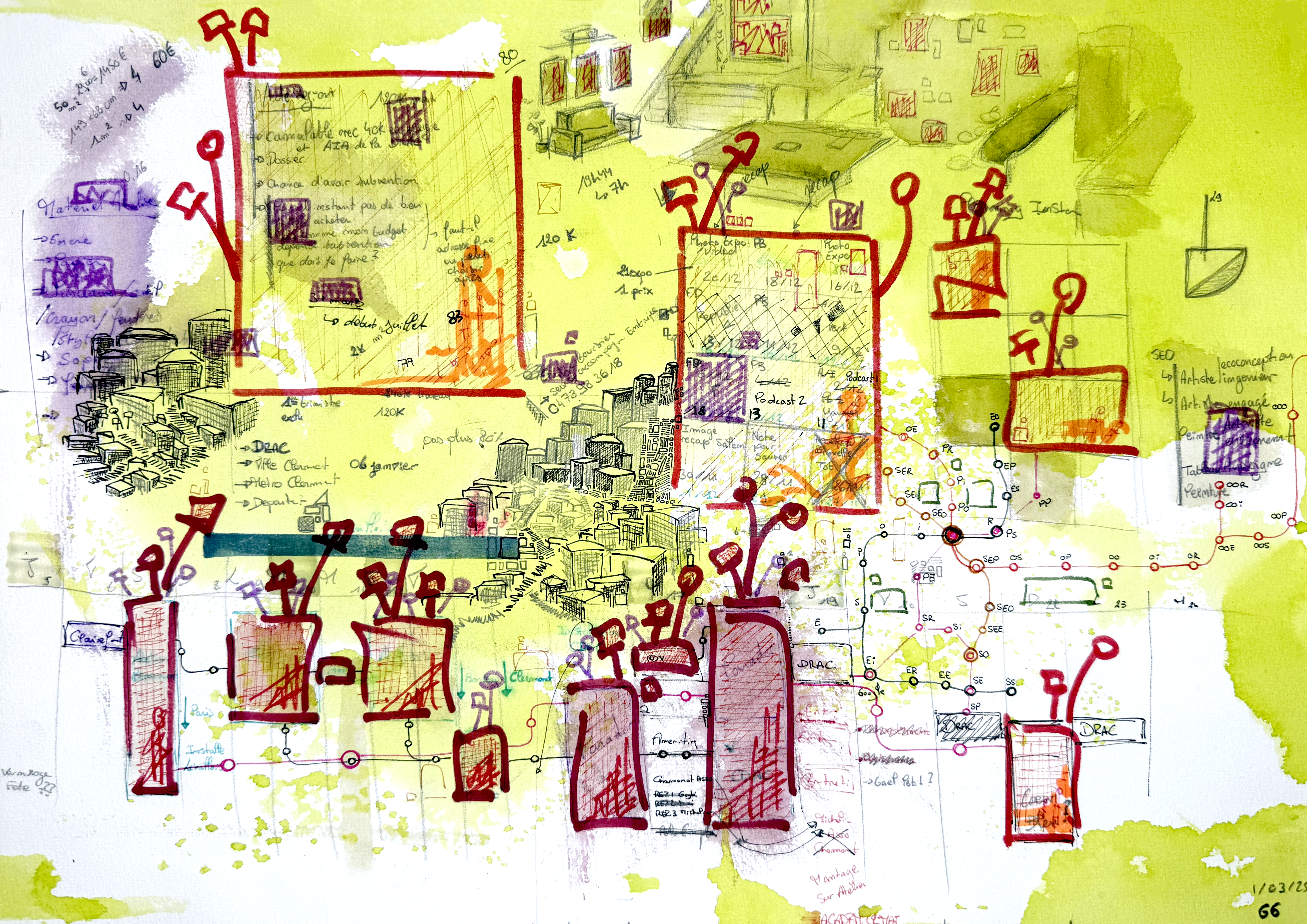 Une série de 220 encres sur papier aux formats variés qui explore des mondes imaginaires géométriques et poétiques. Un questionnement sur notre société, notre manière d’habiter le monde, la construction de nos cités autour des règles géométriques. Il s’agit généralement de villes, ou éléments architecturaux fantasmés. Des formes, des mots, des chiffres viennent se mélanger sur le papier. C’est de la poésie. Chaque mot, chaque forme, chaque chiffre, chaque coup de pinceau suit une musique, une partition.
