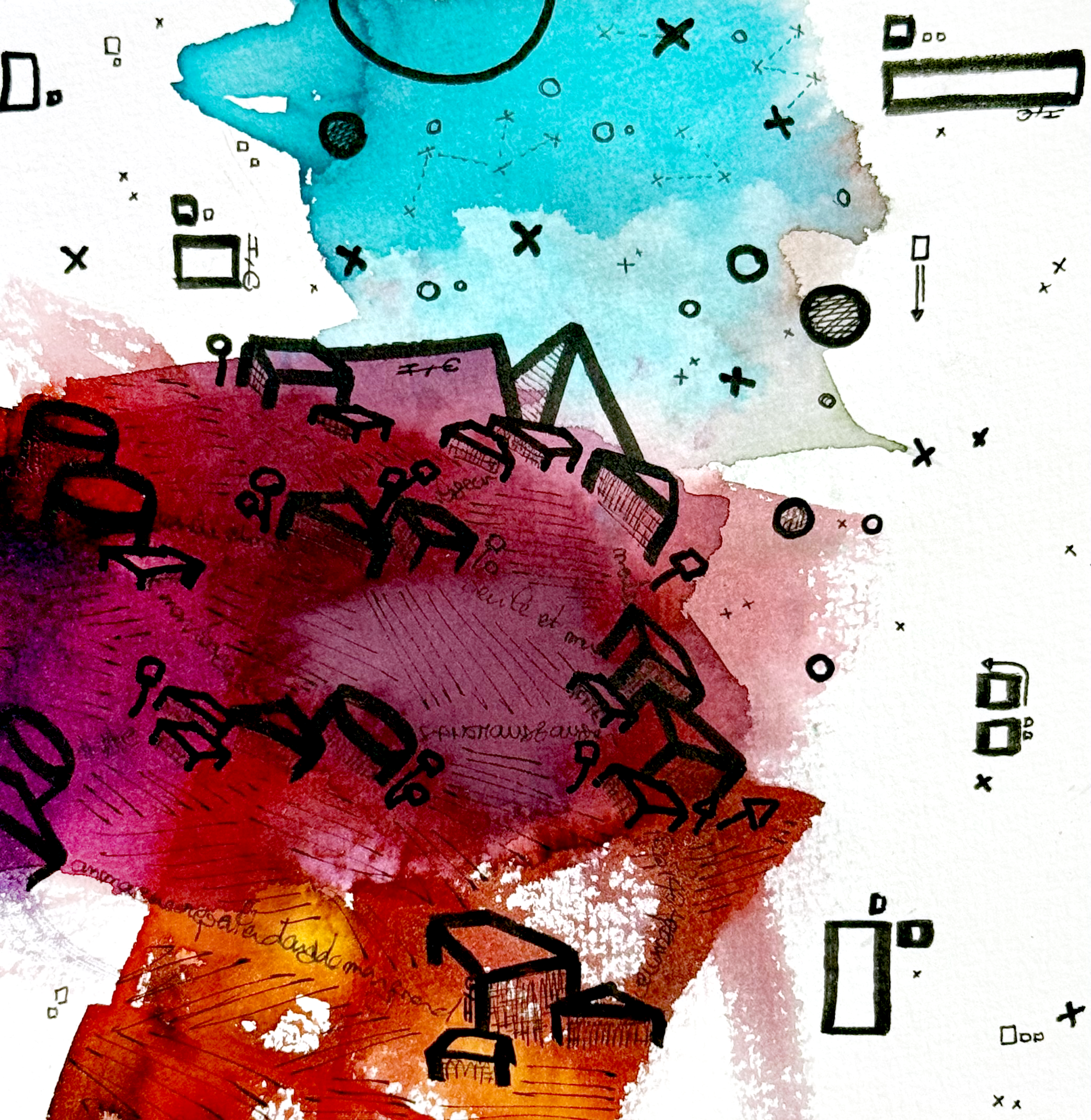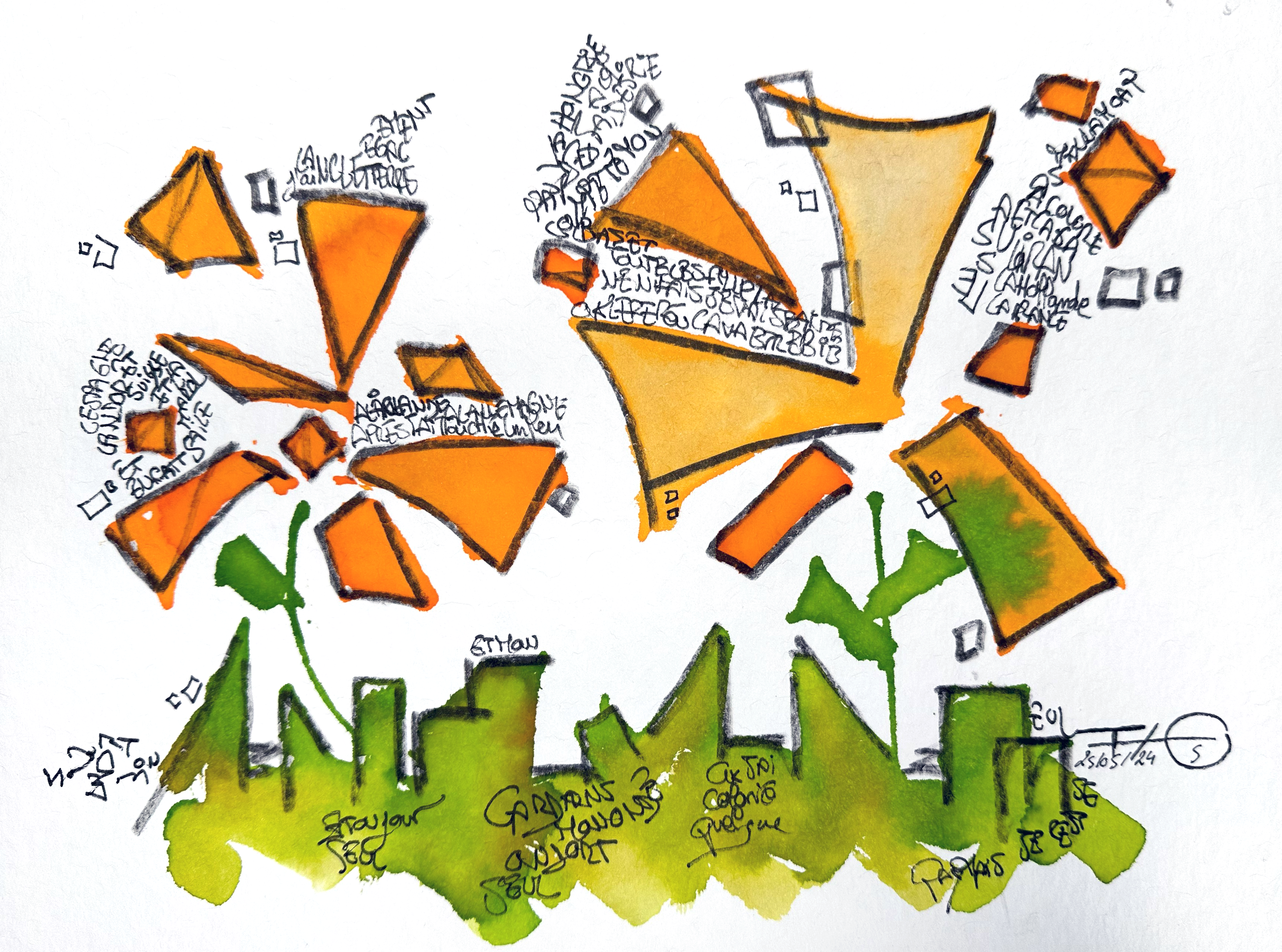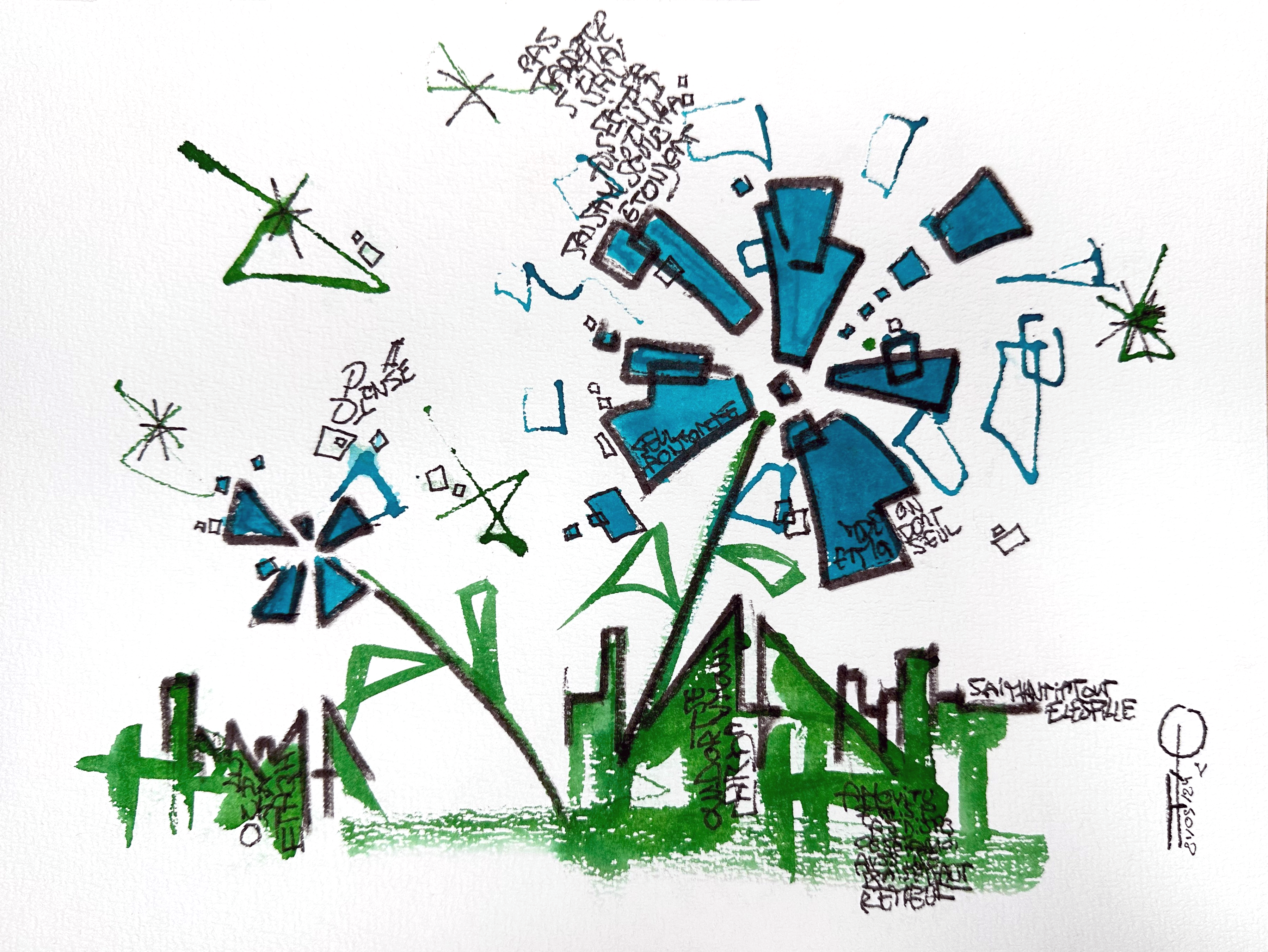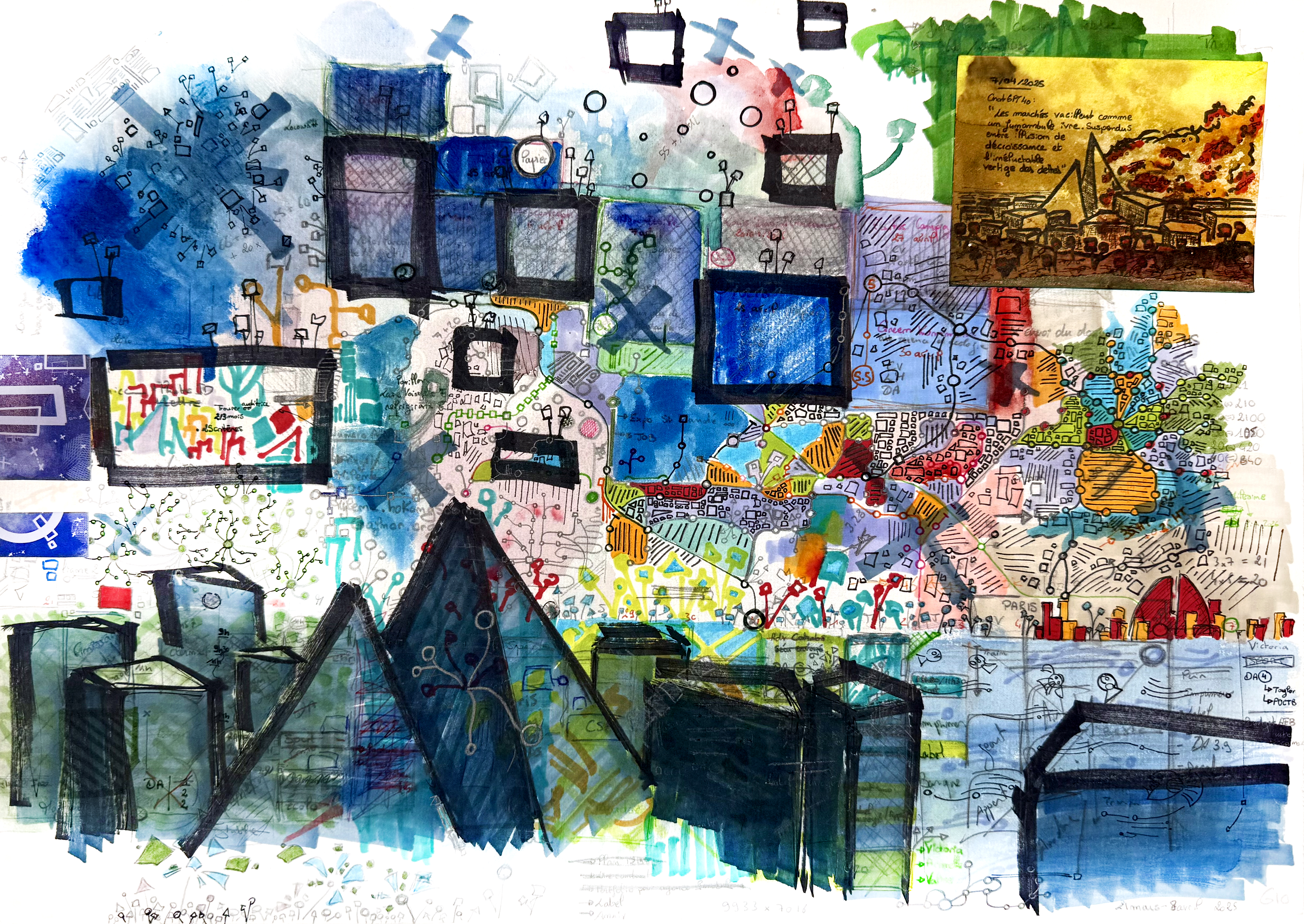 Sur la feuille, ces mondes coexistent sans jamais se fondre totalement. Ils se croisent, se heurtent, se déploient – comme nos sociétés contemporaines, où chaque individu porte en lui une idée de l’avenir. Au premier regard, le tout semble disloqué, chaotique, peut-être même impossible à réunir. Mais en s’approchant, en observant avec attention, on perçoit autre chose : un dialogue muet entre les couleurs, une symphonie visuelle discrète, un langage commun qui émerge du tumulte.