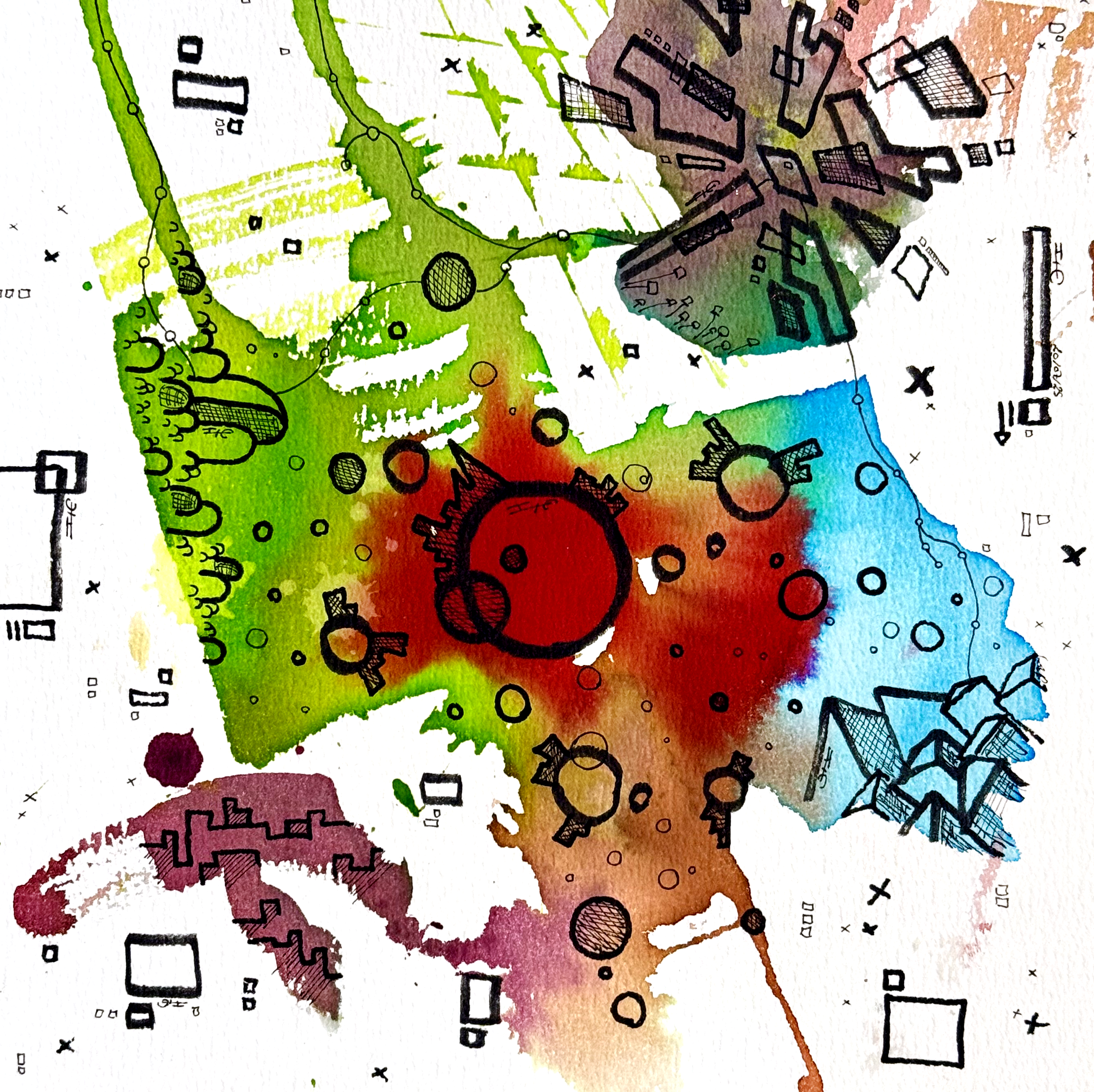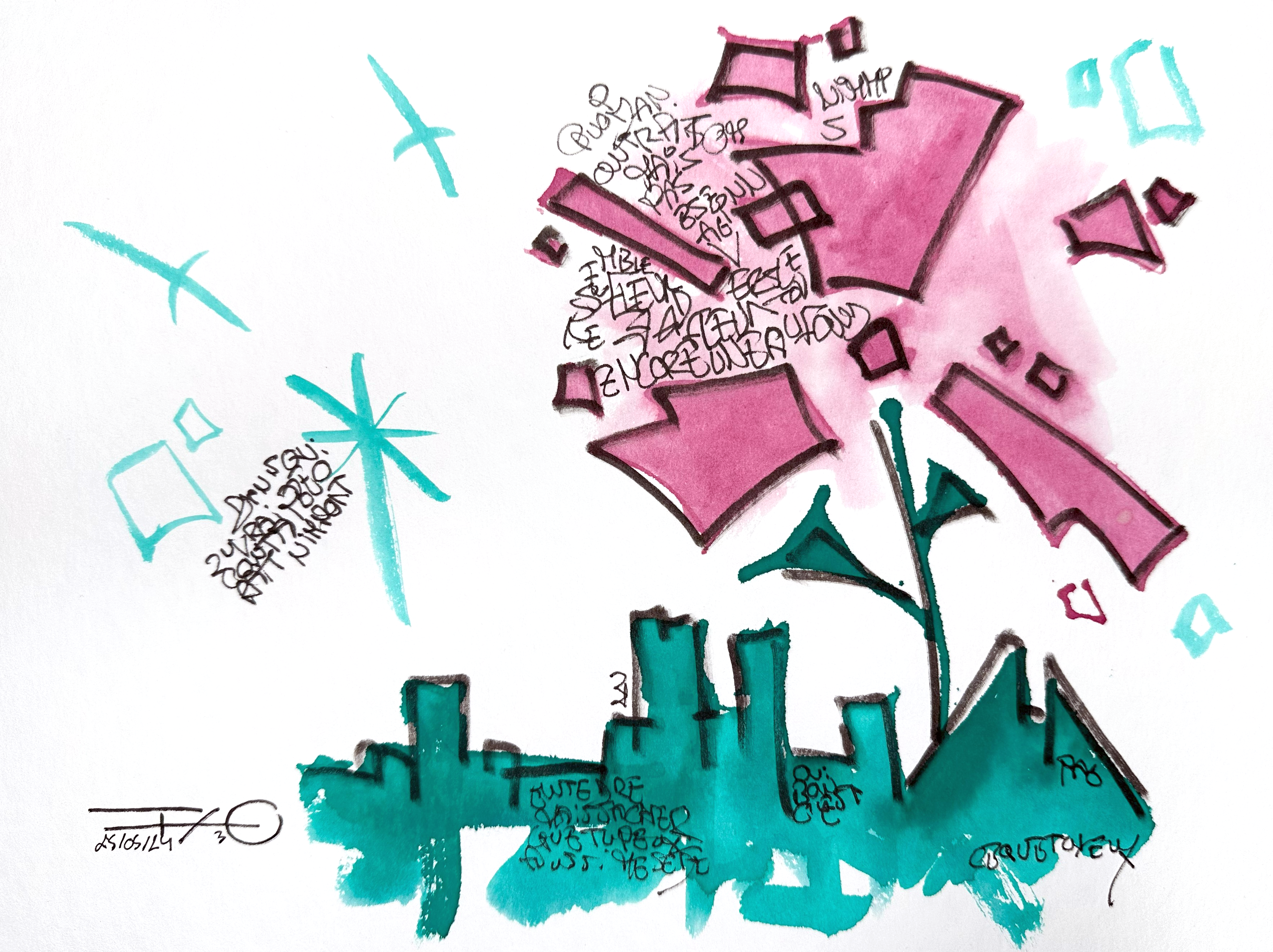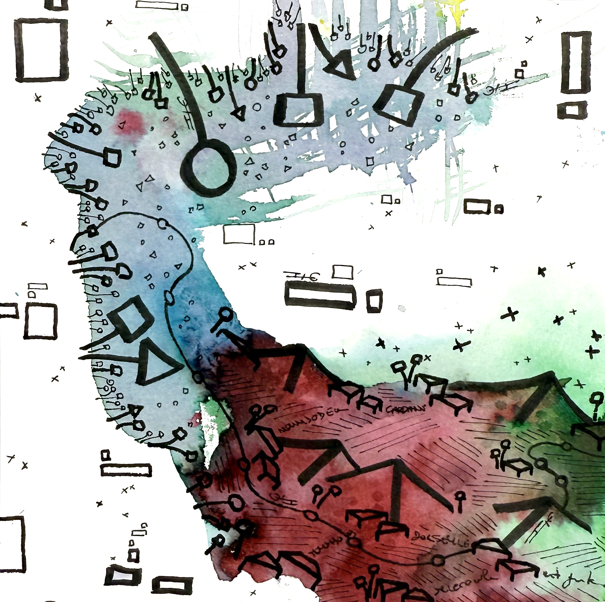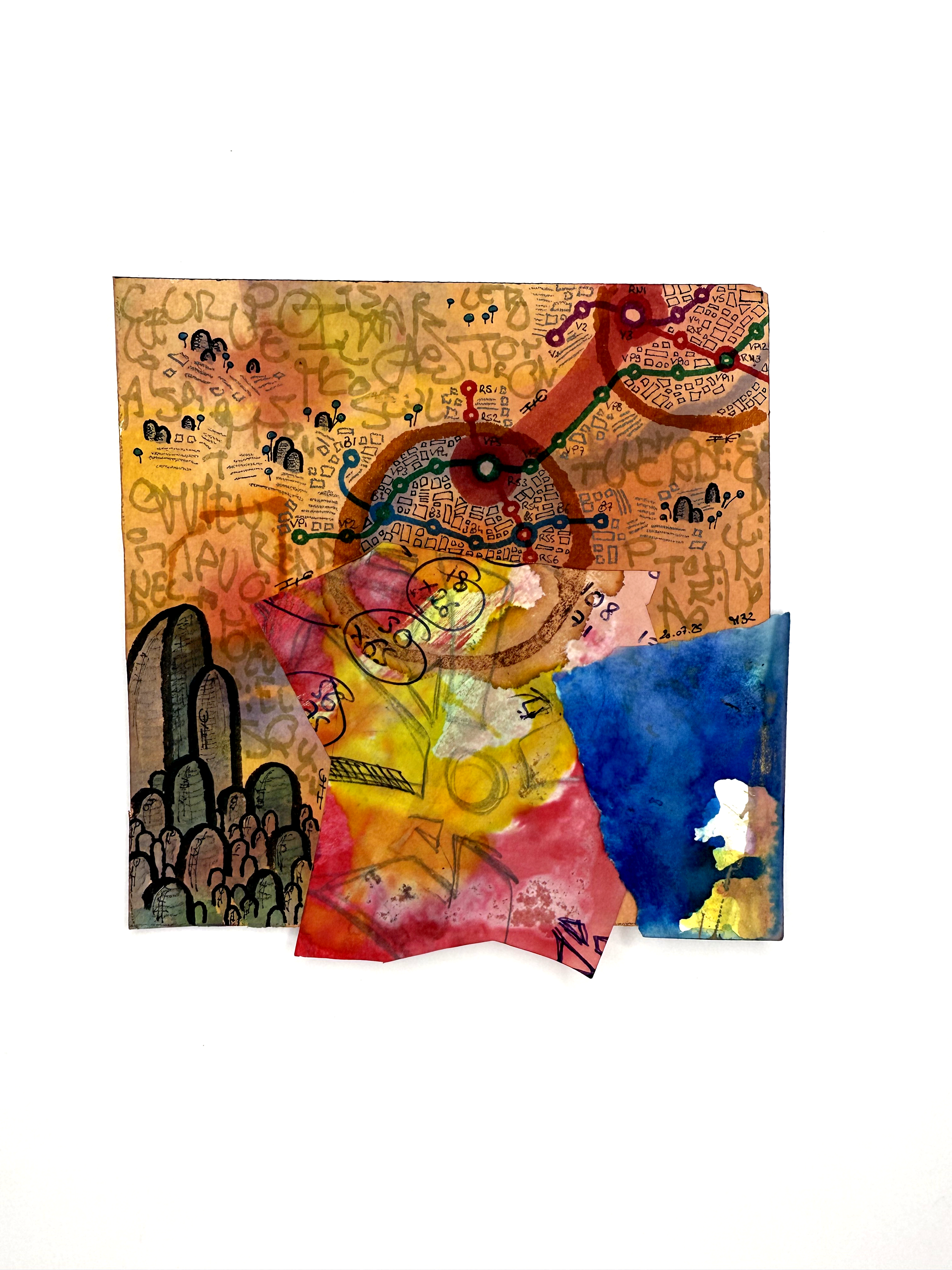 Sur la feuille, ces mondes coexistent sans jamais se fondre totalement. Ils se croisent, se heurtent, se déploient – comme nos sociétés contemporaines, où chaque individu porte en lui une idée de l’avenir. Au premier regard, le tout semble disloqué, chaotique, peut-être même impossible à réunir. Mais en s’approchant, en observant avec attention, on perçoit autre chose : un dialogue muet entre les couleurs, une symphonie visuelle discrète, un langage commun qui émerge du tumulte.