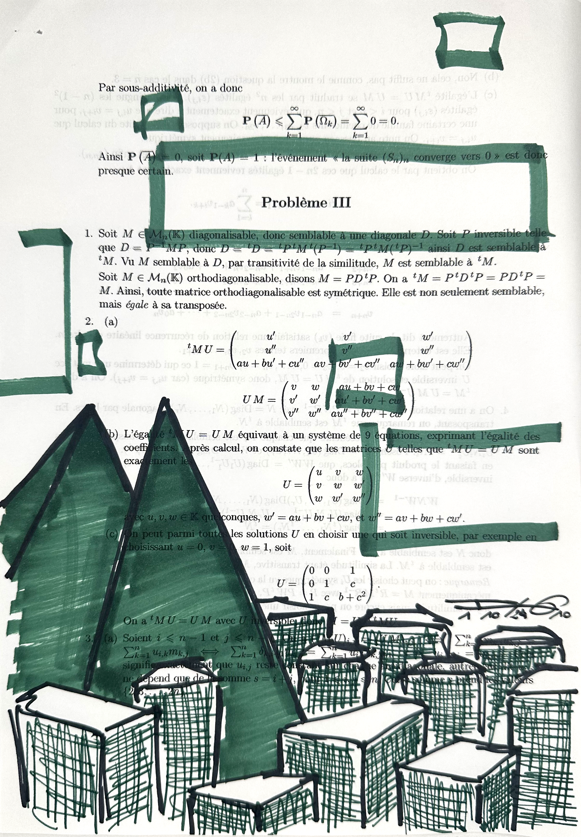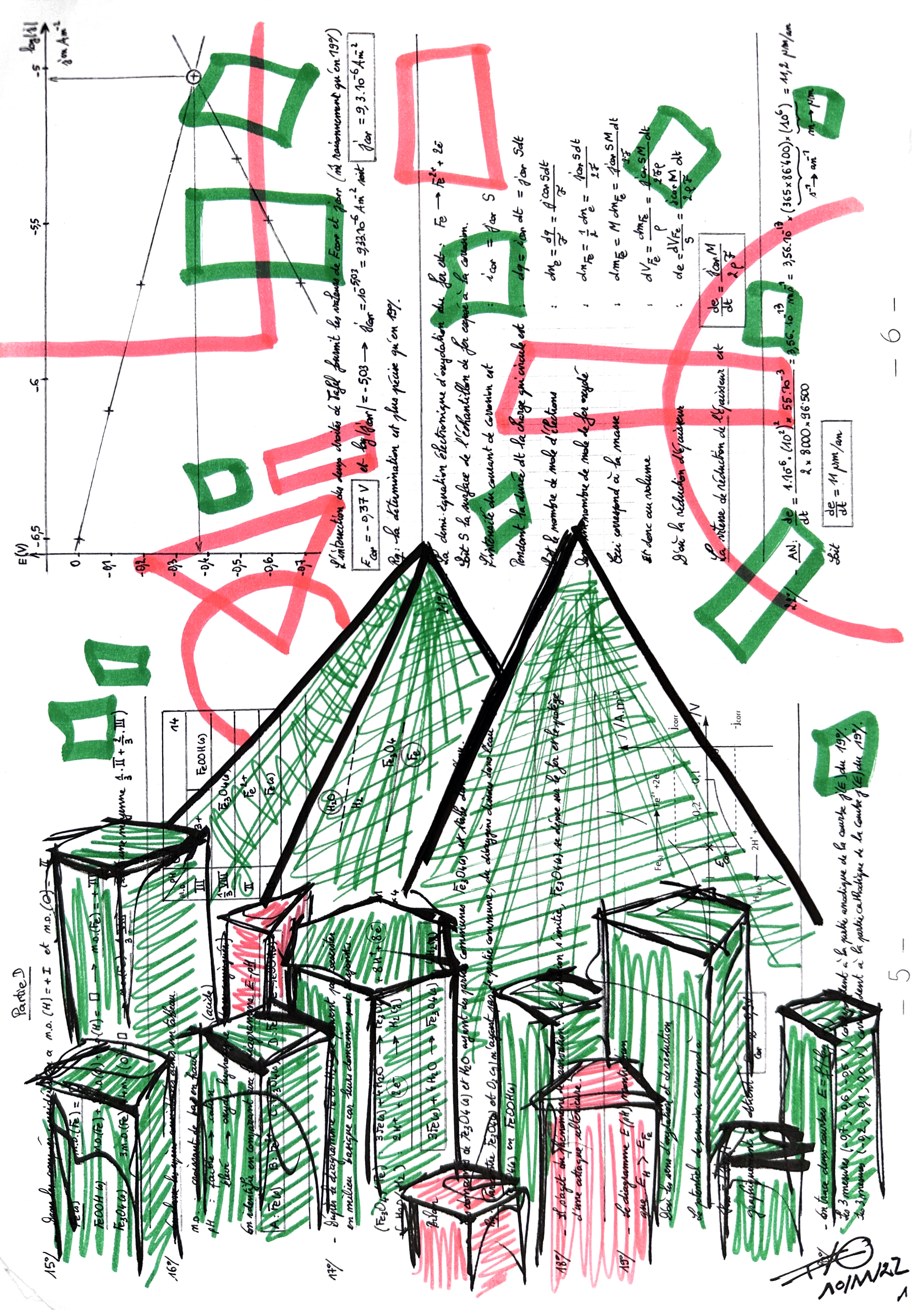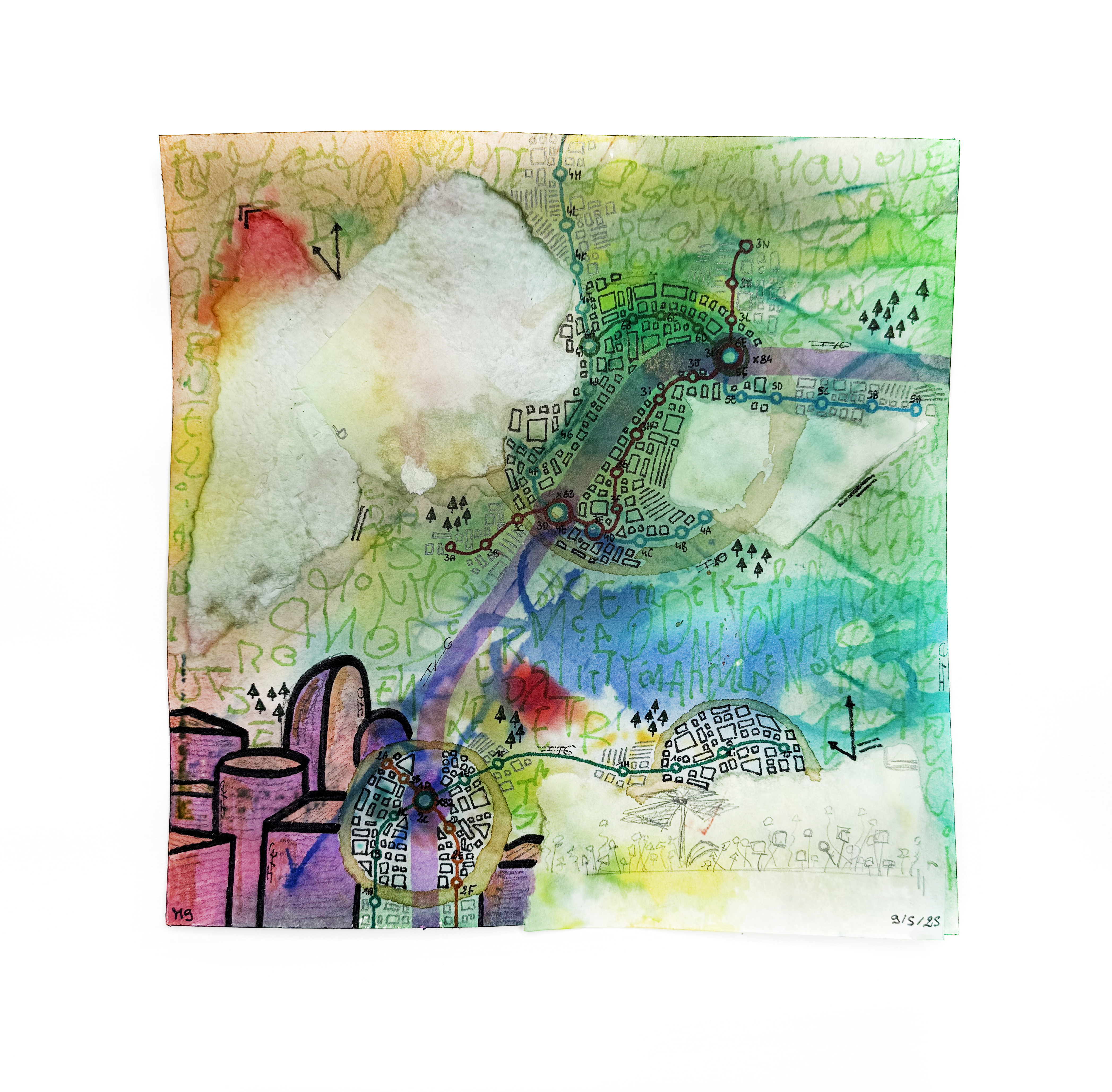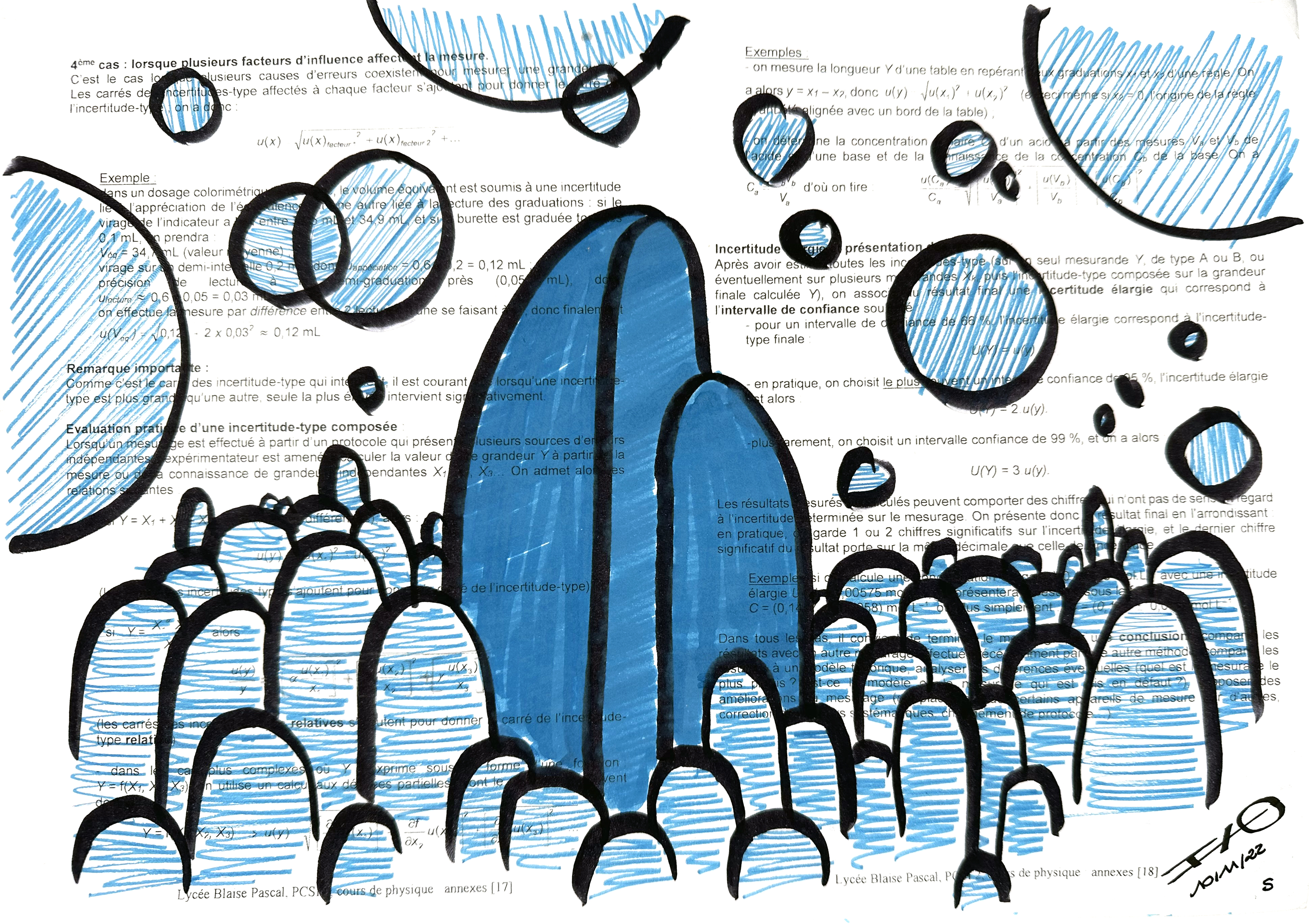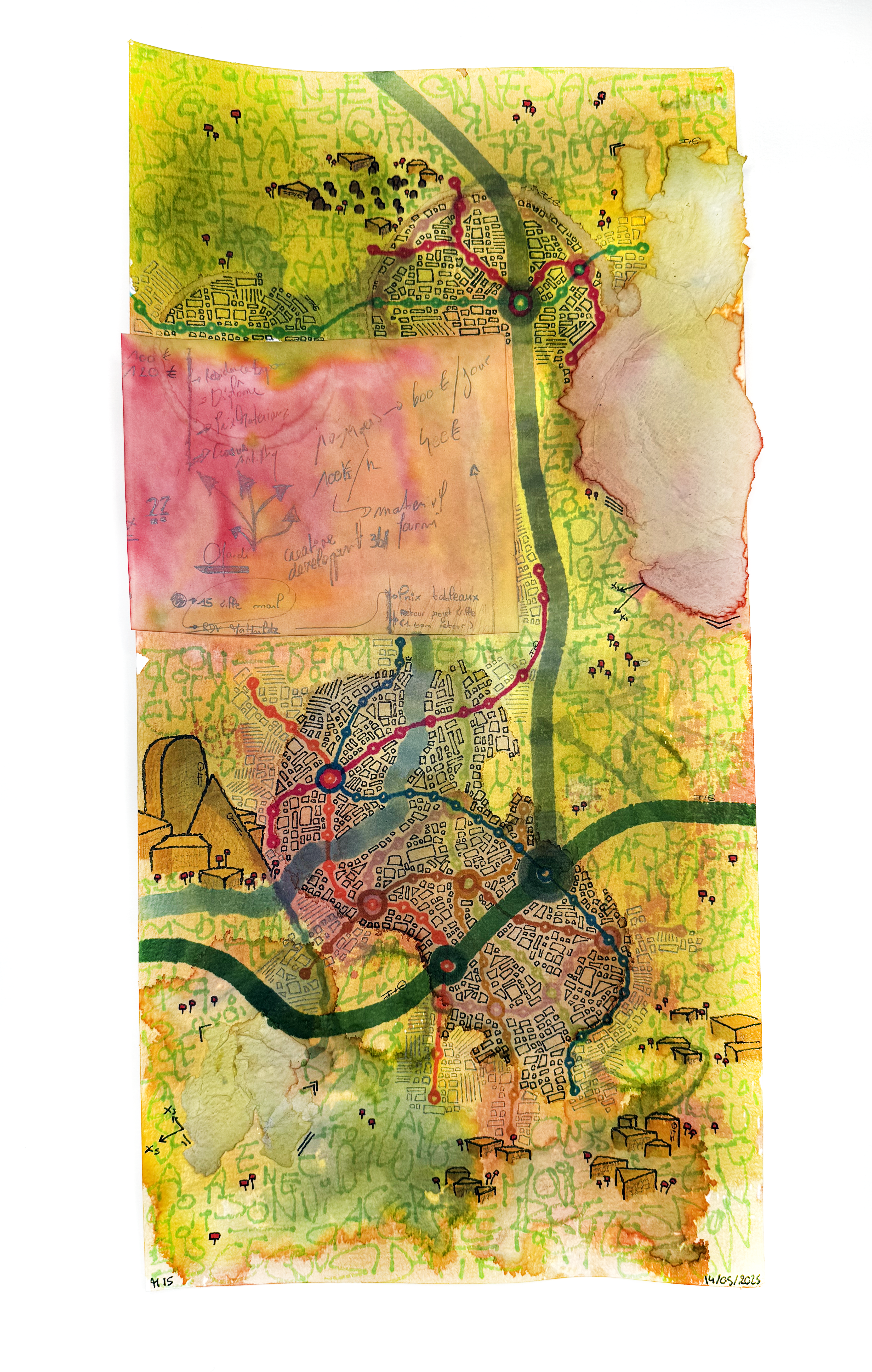 Sur des pages marquées par la rigueur des formules et des théorèmes, la couleur s’invite et transforme le langage scientifique. Artiste/Ingénieur explore la rencontre entre deux mondes : celui de la raison structurée et celui de la création libre. Sur ces notes de cours de physique et de mathématiques issues de classe préparatoire aux grandes écoles d’ingénieur, des villes surgissent, semblant envahir et recouvrir la science. Mais au lieu de la submerger, l’art puise dans ce socle rigide pour en faire émerger des paysages nouveaux. Ici, la science ne disparaît pas sous la pression des feutres et des stylos; elle devient le terreau d’une vision poétique, essentielle à l’édification d’un monde plus lumineux.