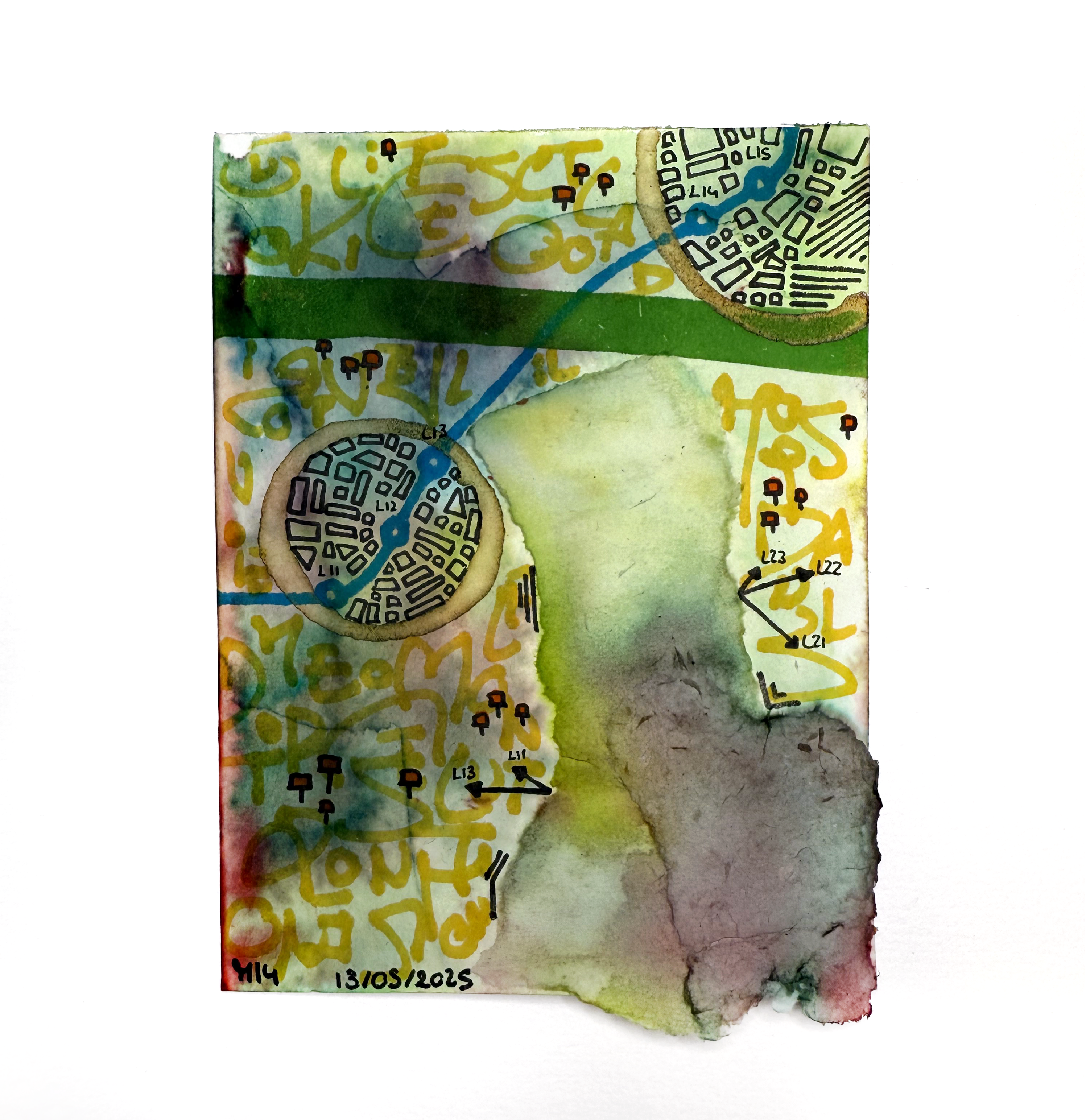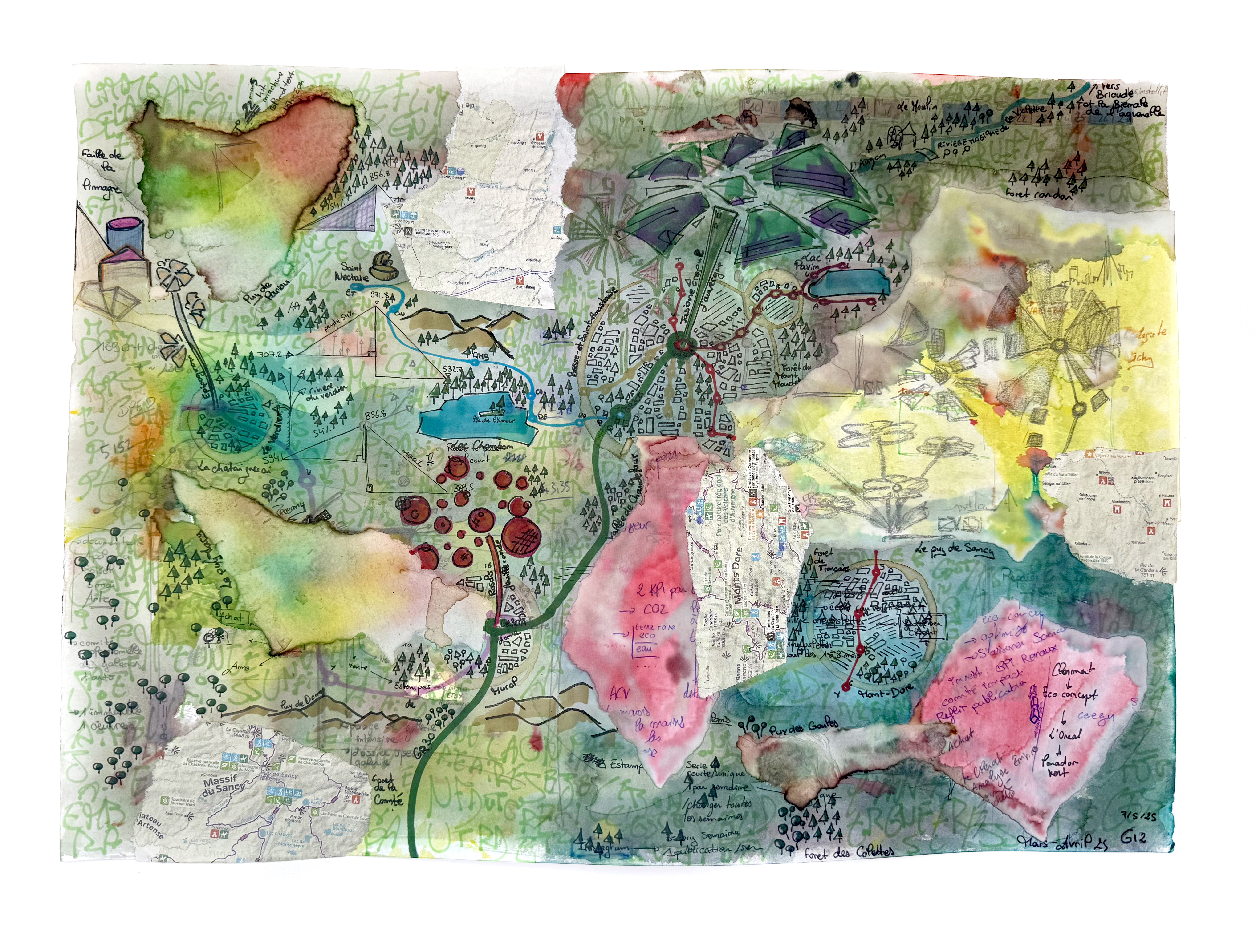 Des collages fragmentés, morceaux de villes, échos de territoires en suspens, viennent enrichir la composition, révélant l’état disloqué de notre monde et la nécessité d’en redessiner les contours. Cachés dans l’entrelacs des traits, des poèmes s’invitent en creux, comme des voix intérieures murmurées à l’oreille du voyageur.