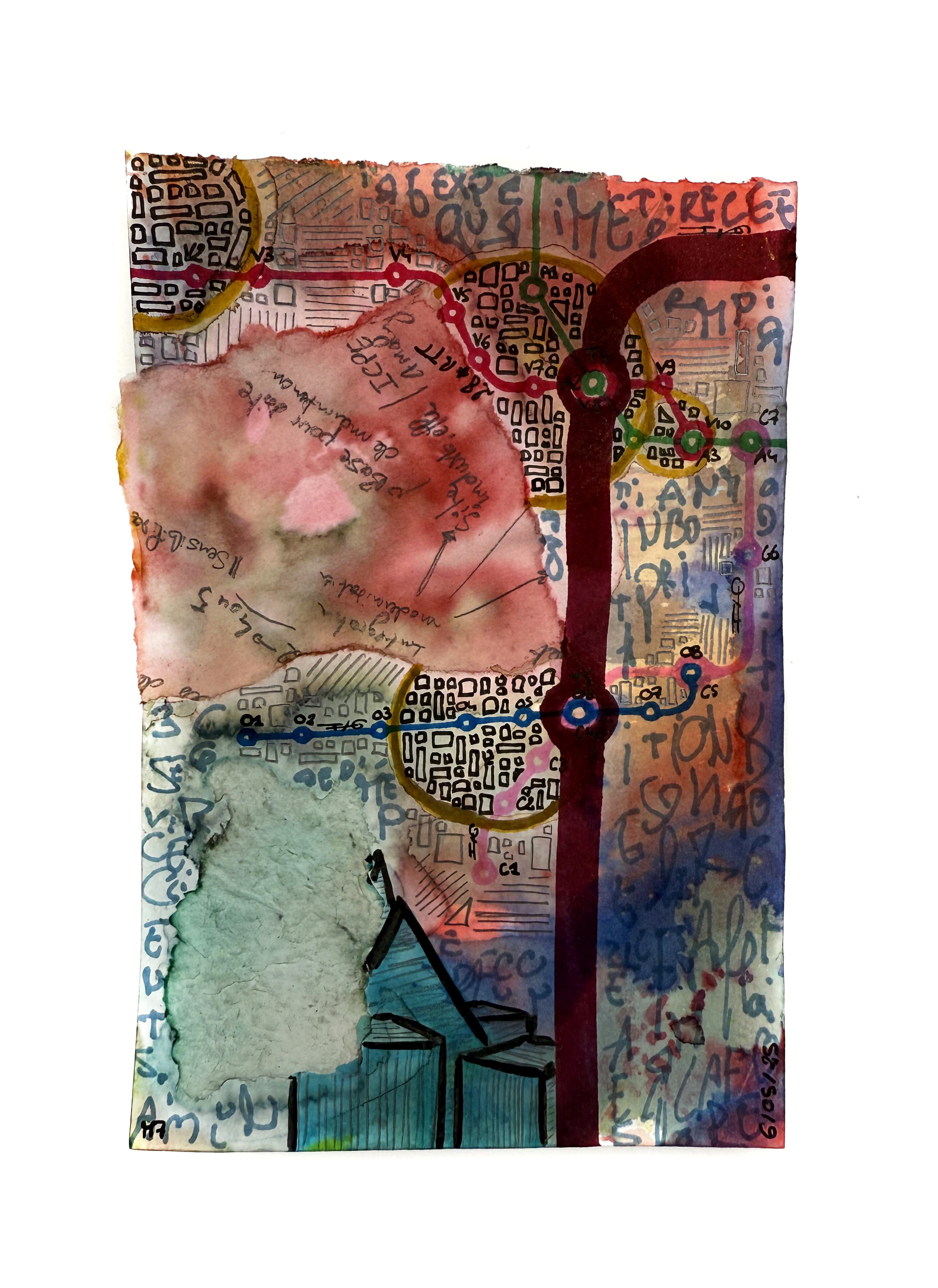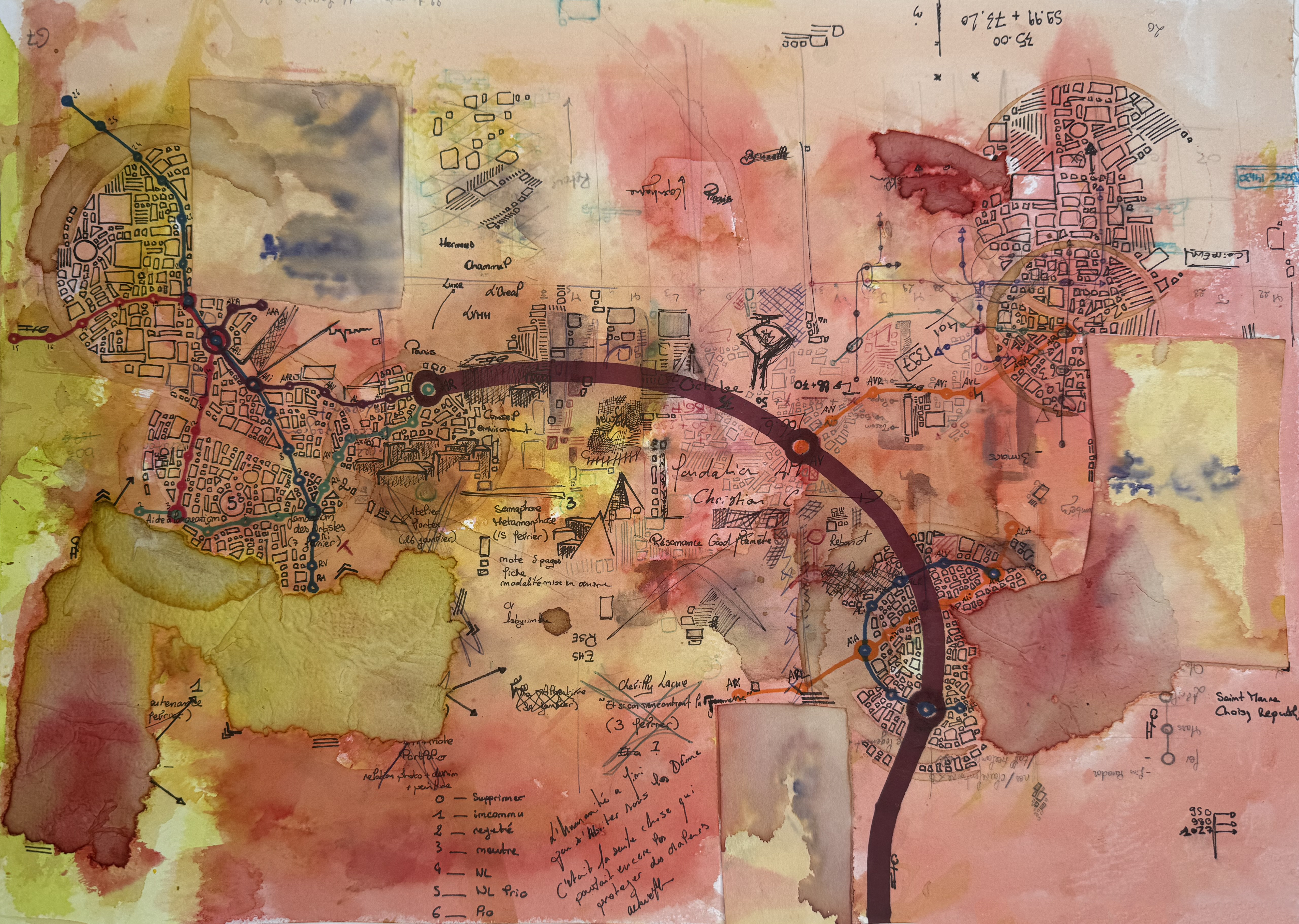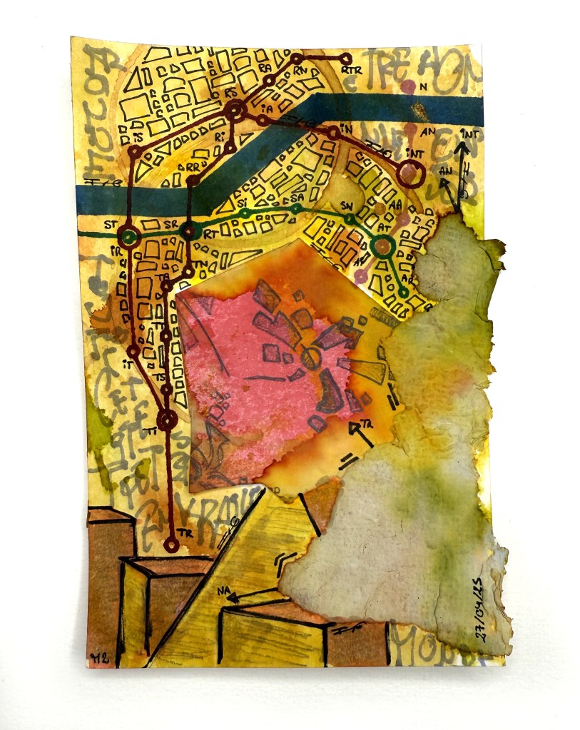 Sur le papier apparaissent des réseaux imaginaires, lignes entrelacées, stations chimériques, bifurcations intimes. Chaque tracé, chaque correspondance évoque une étape, une rencontre, un choix. Les itinéraires urbains deviennent alors des récits, et les plans de métro des cartographies de l’âme.