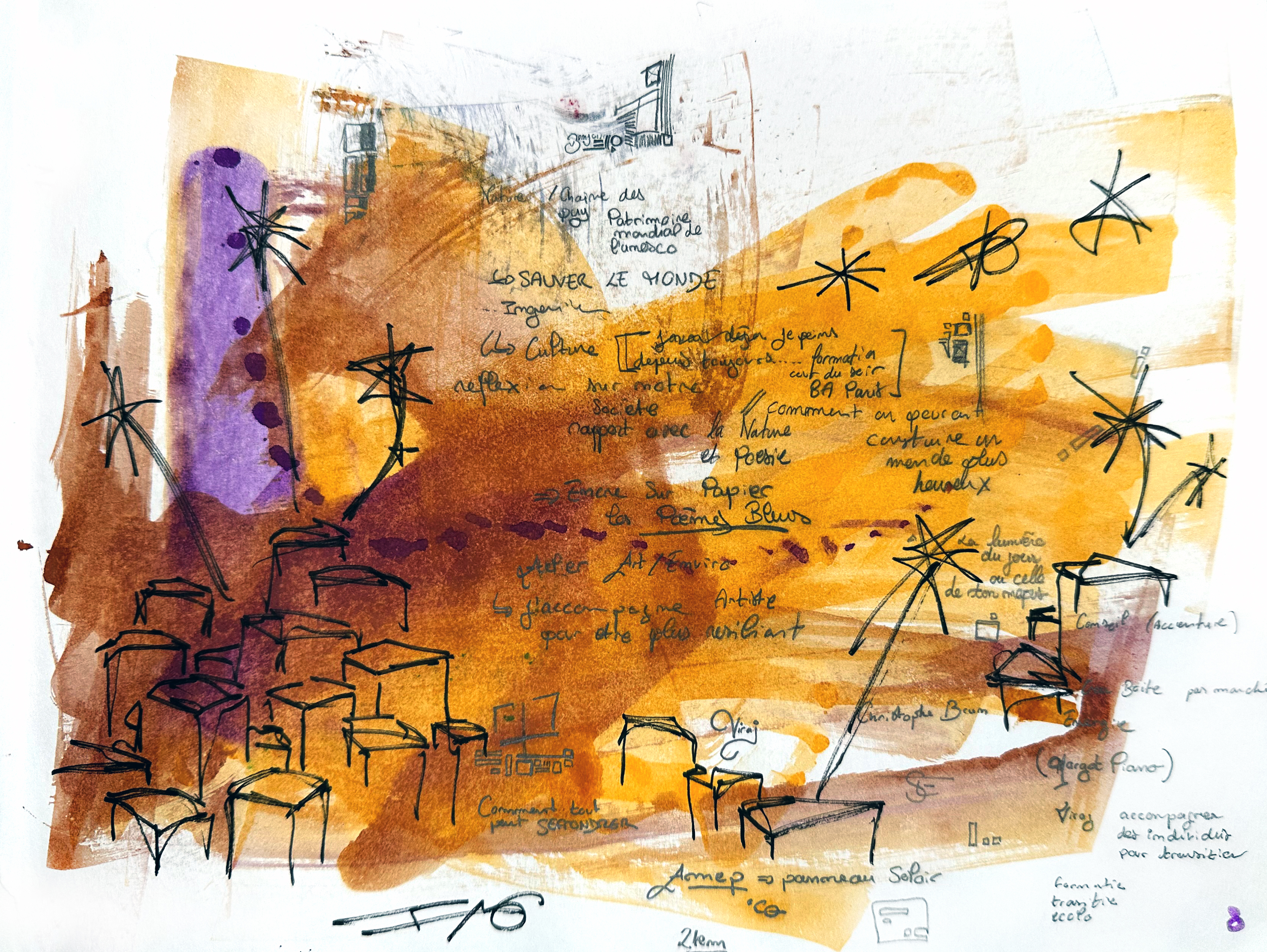 Depuis septembre 2023, sur des feuilles blanches, j’ai consigné un parcours, un manifeste intime et fragmenté. Les Notes pour Sauver le Monde sont les archives de mon engagement, une plongée dans la genèse de ma carrière artistique, mais aussi une réflexion plus vaste sur ma quête pour protéger la planète. Ces pages, initialement dédiées à mes plannings, mes réunions et mes logistiques d’expositions, ont peu à peu évolué vers quelque chose de plus profond : Mes Notes Pour Sauver Le Monde.